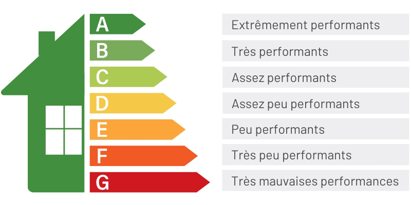 Le diagnostic de performance énergétique classe les logements selon une échelle de 7 classes, nommée "étiquette énergie" :